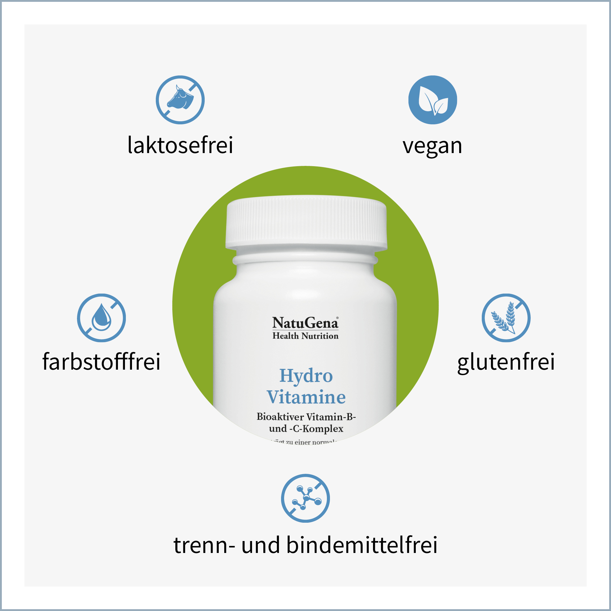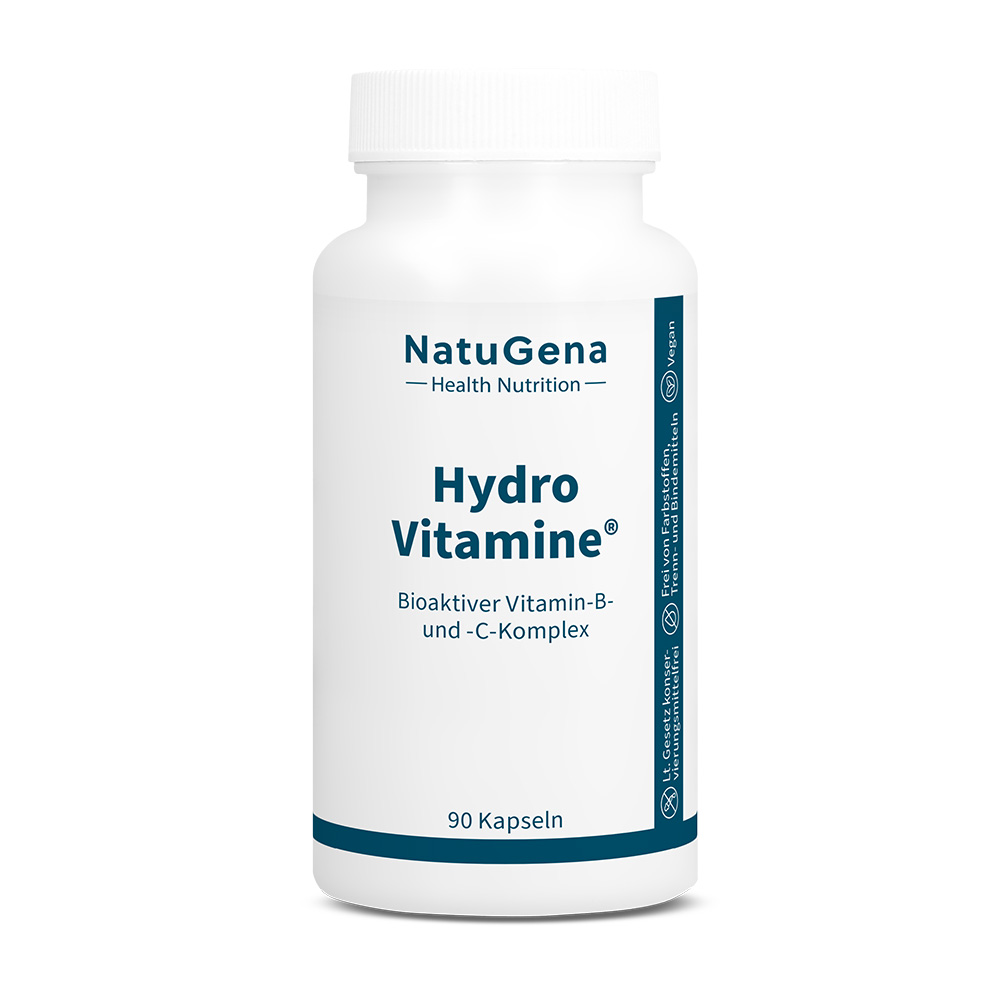 HydroVitamine ist ein hochdosierter Vitamin C- und Vitamin-B-Komplex mit 16 verschiedenen B-Vitaminen sowie verschiedenen Inhaltsstoffe der Vitamin-B-Gruppe. Die Vitaminkombination enthält zudem bioaktive Vitaminformen und natürliches Vitamin C aus der Frucht Camu Camu, die der Körper ohne vorherige Umwandlung direkt verwerten kann.