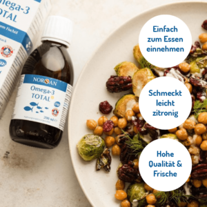 Unser Omega-3 Total (200 ml) mit der Geschmacksrichtung Zitrone besteht aus einem natürlichen hochdosierten aber nicht konzentrierten Fischöl aus Wildfang und einem biologischen kaltgepressten Olivenöl als Antioxidans. Mit einer Tagesdosierung erhalten Sie 2.000 mg Omega-3-Fettsäuren. Durch die flüssige Darreichungsform und den angenehmen Geschmack kann das Öl leicht in den Alltag eingebunden werden. Es kann pur auf einem Esslöffel eingenommen werden oder beispielsweise als Dressing zu Salat sowie als Zutat im Smoothie. Das Fischöl stammt aus nachhaltiger Fischerei und wird von Schadstoffen und PCBs gereinigt.