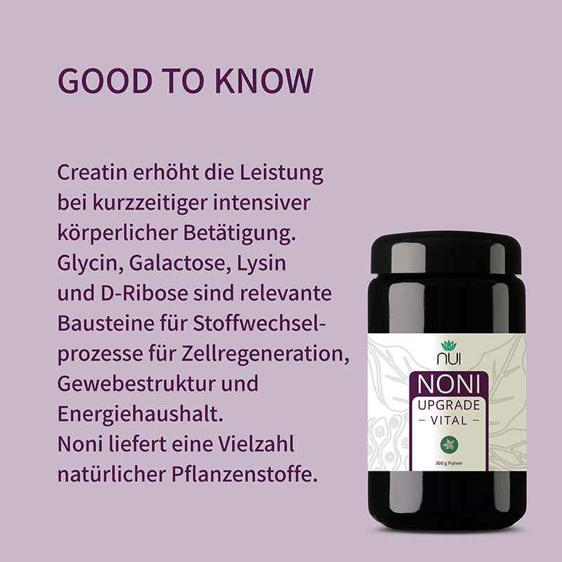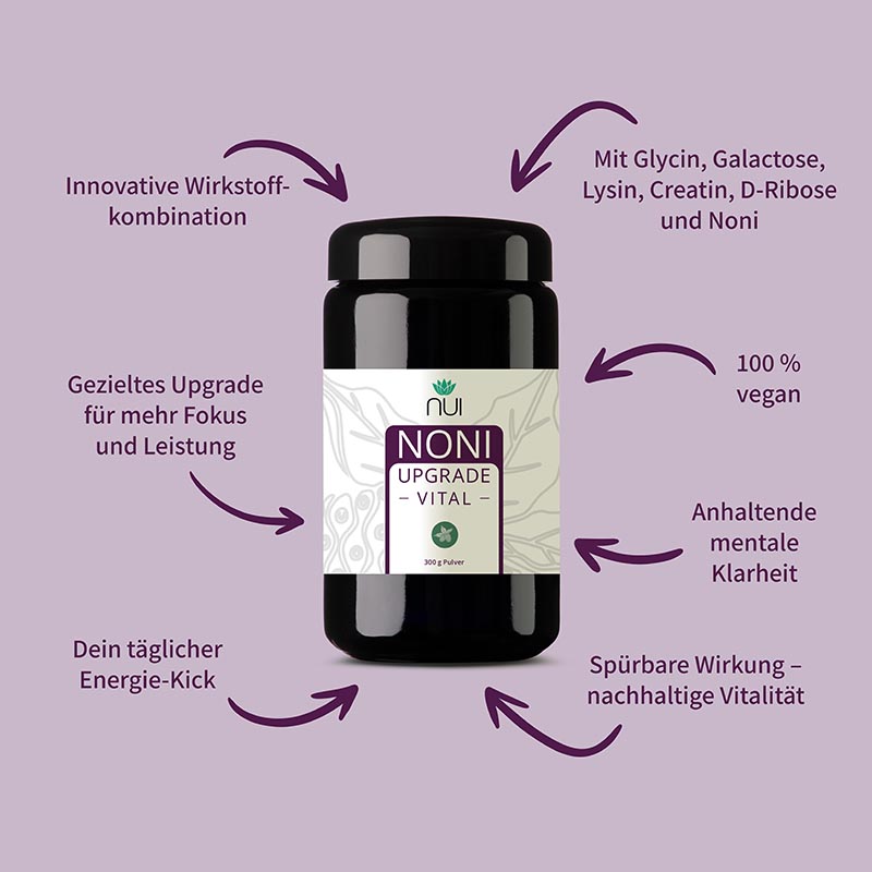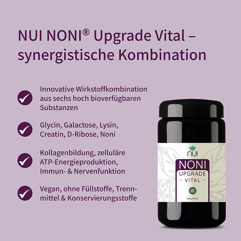 NUI NONI Upgrade Vital vereint sechs hochwertige Wirkstoffe, die deinen Körper auf Zellebene unterstützen – darunter Glycin, Creatin, Galactose, L-Lysin, D-Ribose und sonnengetrocknetes Nonipulver. Diese synergistische Kombination wurde für alle entwickelt, die ihren Alltag, ihre Regeneration und ihre mentale Klarheit gezielt „upgraden“ möchten.
