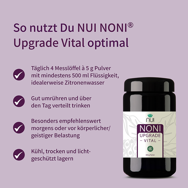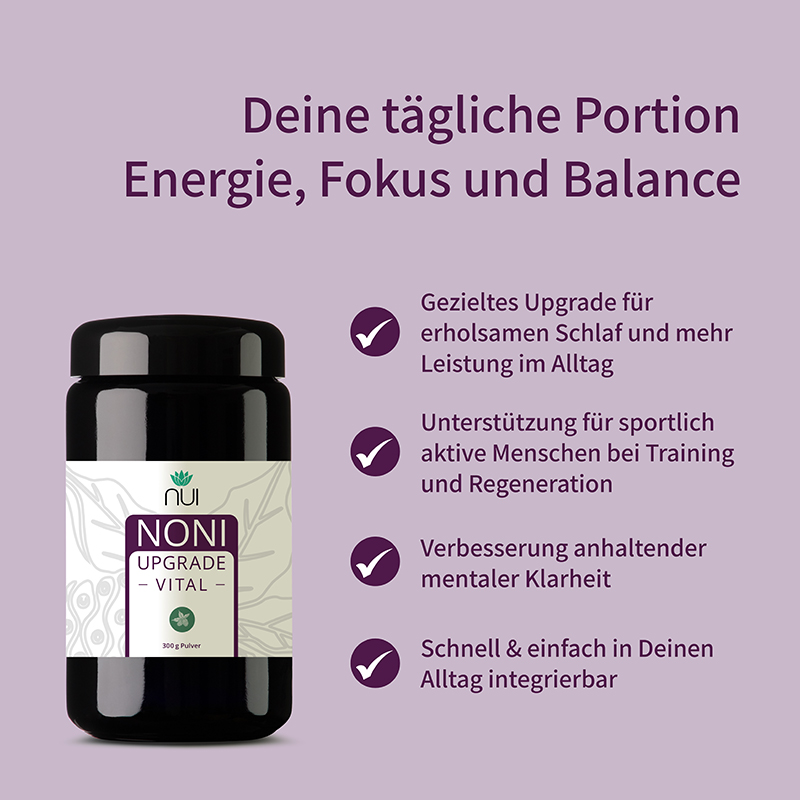 Ob im Büro, beim Training oder in Phasen erhöhter Belastung – NUI NONI Upgrade Vital ist dein täglicher Begleiter für mehr Energie, Fokus und Balance.