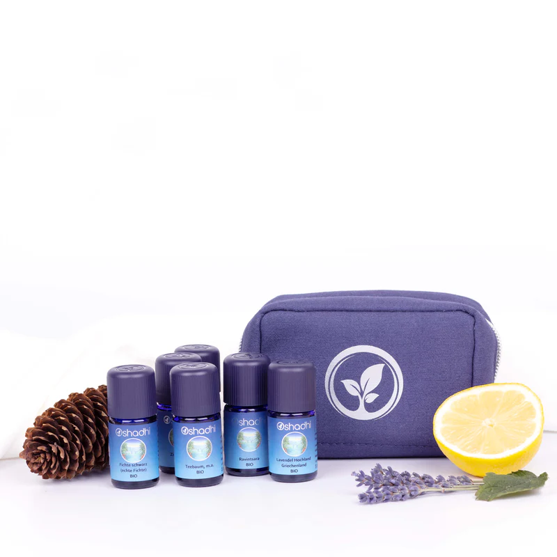 | Inhaltsstoffe | Lavendel fein bio: Lavandula Angustifolia (Lavender) Oil*, Geraniol**, Limonene**, Linalool** Pfefferminze bio: Mentha Piperita (Peppermint) Oil*, Limonene**, Linalool** Teebaum bio: Melaleuca Alternifolia (Tea Tree) Leaf Oil*, Limonene** Zitrone gelb bio: Citrus limonum* Fichte schwarz bio: Picea mariana* Ravintsara bio: Cinnamomum camphora cineoliferum* * aus kontrolliert biologischem Anbau ** natürliche Bestandteile des ätherischen Öls Inklusive Täschchen für 6 ätherische Öle. |