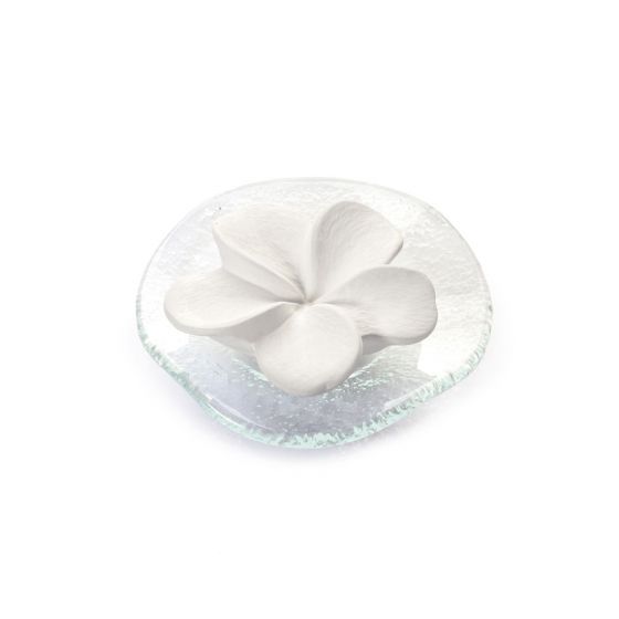 Der Duftstein Frangipani aus Keramik wird mit einem hübschen Glasteller als Untersatz geliefert.